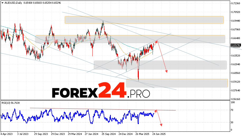 AUD/USD Weekly Forecast June 30 — July 4, 2025 suggests an attempt at a bullish correction and a test of the 0.6575 level. Further, the currency pair will continue to fall below the 0.6065 level. The test of the trend line on the relative strength indicator will support the decline of the pair in the current trading week. A strong growth and a breakout of the 0.6755 area will cancel the decline scenario. This will indicate a breakout of the resistance area and a continuation of the pair’s rise with a target above 0.7175.