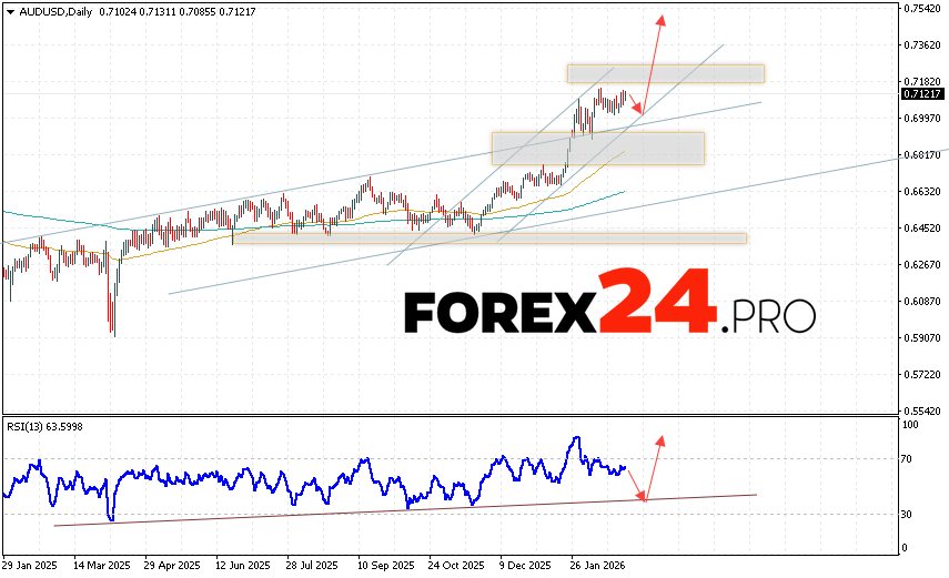 AUD/USD Weekly Forecast March 2 – 6, 2026 suggests a bearish correction toward 0.6985, followed by continued growth above 0.7475. A breakout below 0.6845 would cancel the bullish scenario and indicate a decline toward levels below 0.6615.