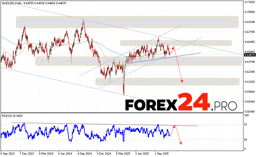 AUD/USD Weekly Forecast November 10 – 14, 2025suggests an attempt to develop a bullish correction and test the 0.6525 level. Subsequently, the currency pair is expected to continue falling below 0.6115. A test of the trend line on the relative strength indicator (RSI) would support a decline in the pair this trading week. A strong rally and a breakout of the 0.6765 area would cancel out the downside scenario. This would indicate a breakout of the resistance area and a continued rise in the pair with a target above 0.7135.