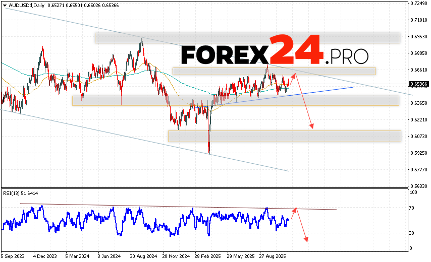 AUD/USD Weekly Forecast November 17 – 21, 2025 suggests an attempt to develop a bullish correction and test the 0.6585 level. Subsequently, the currency pair is expected to continue falling below 0.6095. A test of the trend line on the relative strength indicator (RSI) will support a decline in the pair this trading week. A strong rally and a breakout of the 0.6805 area would cancel out the downside scenario. This would indicate a breakout of the resistance area and a continued rise in the pair with a target above 0.7265.