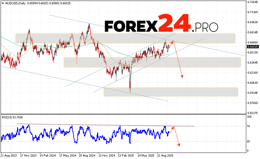 AUD/USD Weekly Forecast October 6 — 10, 2025 suggests an attempt to develop a bullish correction and test the 0.6665 level. Subsequently, the currency pair is expected to continue falling below 0.6175. A test of the trendline on the relative strength indicator (RSI) will support a decline this week. A strong rally and a breakout of the 0.6815 area will cancel out the downside scenario. This will indicate a breakout of the resistance area and a continued rise with a target above 0.7225.