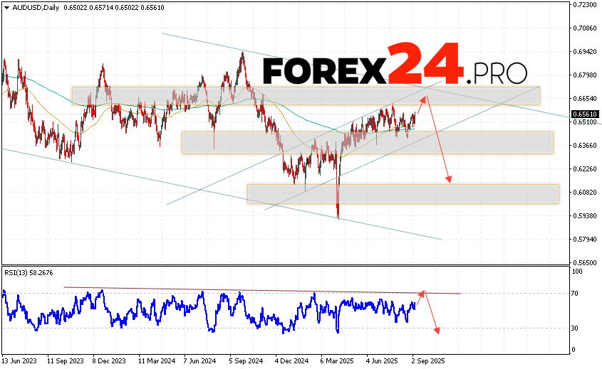 AUD/USD Weekly Forecast September 8 – 12, 2025 suggests an attempt to develop a bullish correction and test the level of 0.6655. Further, the currency pair will continue to fall below the level of 0.6135. The test of the trend line on the relative strength indicator will be in favor of the pair’s decline in the current trading week. The cancellation of the fall option will be a strong growth and a breakout of the 0.6805 area. This will indicate a breakout of the resistance area and a continuation of the pair’s rise with a target above 0.6945.