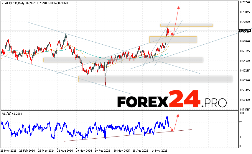 AUDUSD Weekly Forecast February 9 – 13, 2026 suggests an attempt to develop a bearish correction and test the 0.6965 level. Further growth is expected above 0.7445. A test of the trendline on the relative strength indicator (RSI) will support the pair’s upside this week. A decline and a breakout of the 0.6745 area will cancel out the upward trend. This would indicate a breakout of the support area and a continued decline with a target below 0.6485.