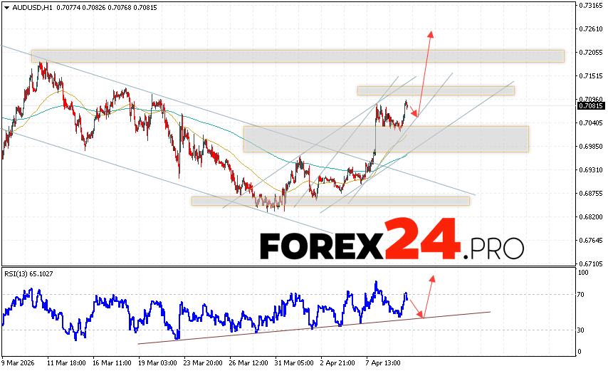 Australian Dollar Forecast AUD/USD for April 10, 2026 suggests an attempt to test the support level near 0.7045. Further growth above 0.7255. An additional signal in favor of an uptrend would be a rebound from the trend line on the relative strength indicator. A reversal of the upward trend would be a reversal of the AUD/USD price and a breakout of 0.6995. This would indicate a continued decline in the price, with a potential target below 0.6805.