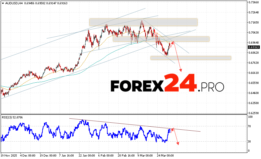 Australian Dollar Forecast AUD/USD for April 2, 2026 suggests an attempt to test the resistance level near 0.6965. Subsequently, a continued decline below 0.6675. An additional signal in favor of the pair’s decline would be a rebound from the trend line on the relative strength indicator. A strong rise in AUD/USD and a breakout of 0.6995 would cancel the downward scenario. This indicates a continued rise in quotes with a potential target above 0.7145.