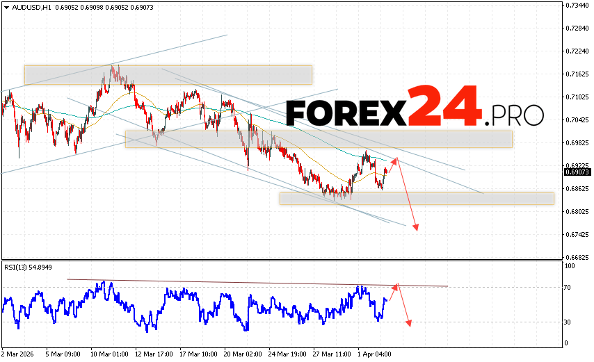 Australian Dollar Forecast AUD/USD for April 3, 2026 suggests an attempt to test the resistance level near 0.6930. Subsequently, a continued decline below 0.6745. An additional signal in favor of the pair’s decline would be a rebound from the trend line on the relative strength indicator. A strong rise in AUD/USD and a breakout of 0.6995 would cancel the downward scenario. This indicates a continued rise in quotes with a potential target above 0.7165.
