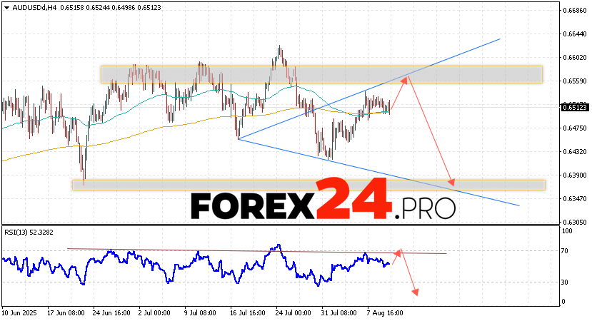 Australian Dollar Forecast AUD/USD for August 13, 2025 suggests an attempt to test the resistance level near the 0.6545 area. Further, the pair’s quotes will continue to fall below the 0.6385 level. An additional signal in favor of the pair’s decline will be a rebound from the trend line on the relative strength indicator. The cancellation of the fall option will be a strong increase in AUD/USD quotes and a breakout of the 0.6625 area. This will indicate a continuation of the rise in quotes with a potential target above the 0.6805 level.