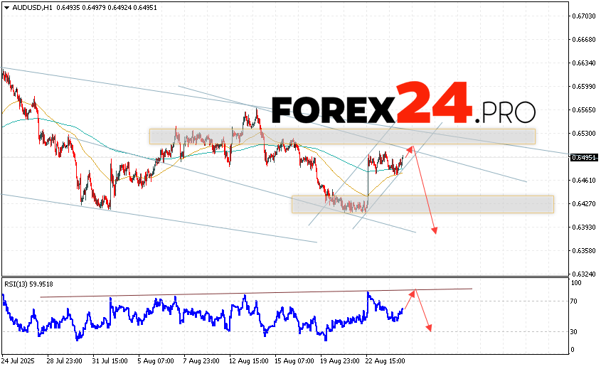 Australian Dollar Forecast AUD/USD for August 27, 2025 suggests an attempt to test the resistance level near the 0.6505 area. Further, the pair’s quotes will continue to fall below the 0.6375 level. An additional signal in favor of the pair’s decline will be a rebound from the trend line on the relative strength indicator. The cancellation of the fall option will be a strong increase in AUD/USD quotes and a breakout of the 0.6555 area. This will indicate a continuation of the rise in quotes with a potential target above the 0.6805 level.