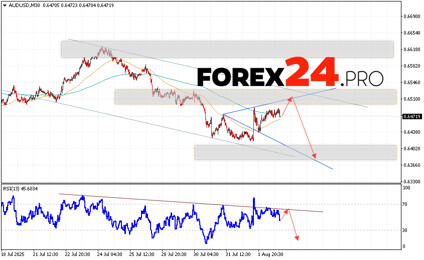 Australian Dollar Forecast AUD/USD for August 5, 2025 suggests an attempt to test the resistance level near the 0.6495 area. Further, the pair will continue to fall below the 0.6365 level. An additional signal in favor of a decline in the pair will be a rebound from the trend line on the relative strength indicator. A strong rise in AUD/USD quotes and a breakout of the 0.6545 area will cancel the decline scenario. This will indicate a continuation of the rise in quotes with a potential target above the 0.6785 level.
