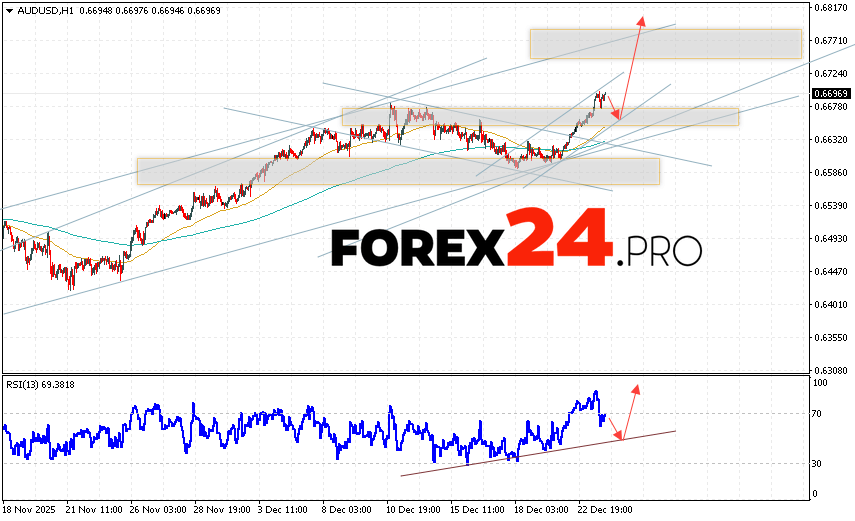 Australian Dollar Forecast AUD/USD for December 24, 2025 suggests an attempt to test the support level near 0.6645. Subsequently, continued growth above 0.6795. An additional signal in favor of the pair’s upside would be a rebound from the trend line on the relative strength indicator. The upside scenario would be cancelled if AUD/USD quotes fall and break below 0.6625. This would indicate continued declines with a potential target below 0.6425.