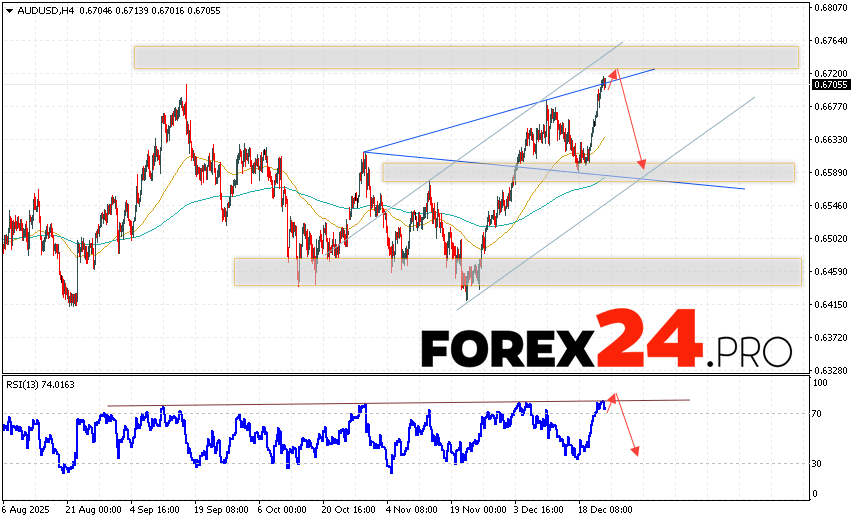 Australian Dollar Forecast AUD/USD for December 26, 2025 suggests an attempt to test the resistance level near 0.6625. Subsequently, a continued decline in the pair above 0.6575. An additional signal in favor of the pair’s decline would be a rebound from the trend line on the relative strength indicator. The downside scenario would be cancelled if AUD/USD quotes fall and break above 0.6765. This would indicate continued price growth with a potential target above 0.6855.
