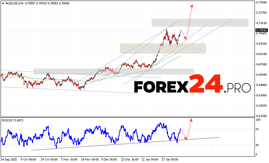 Australian Dollar Forecast AUD/USD for February 10, 2026 suggests an attempt to test the support level near 0.7035. Subsequently, continued growth above 0.7345. An additional signal in favor of the pair’s upside would be a rebound from the trend line on the relative strength indicator. The upside scenario would be cancelled if AUD/USD quotes fall and break above 0.6885. This would indicate a continued decline with a potential target below 0.6545.
