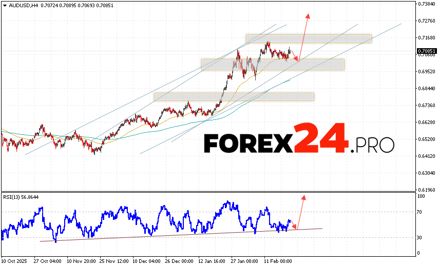 Australian Dollar Forecast AUD/USD for February 24, 2026 suggests an attempt to test the support level near 0.6985. Subsequently, continued growth above 0.7275. An additional signal in favor of the pair’s upside would be a rebound from the trend line on the relative strength indicator. The upside scenario would be cancelled if AUD/USD quotes fall and break below 0.6935. This would indicate a continued decline with a potential target below 0.6745.