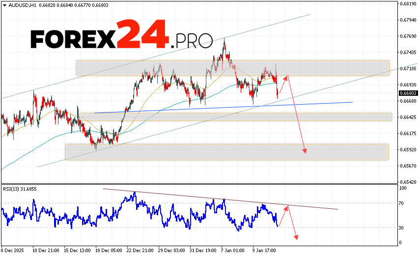 Australian Dollar Forecast AUD/USD for January 14, 2026 suggests an attempt to test the resistance level near 0.6705. Subsequently, the pair’s decline should be confirmed with a breakout of the support area and a close below 0.6625. An additional signal supporting a decline in the pair will be a rebound from the trend line on the relative strength indicator. A strong rise in AUD/USD quotes and a breakout of the 0.6805 area would cancel the downside scenario. This would indicate continued price growth with a potential target above 0.6975.