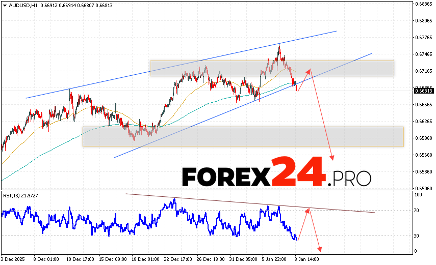 Australian Dollar Forecast AUD/USD for January 9, 2026 suggests an attempt to test the resistance level near 0.6715. Subsequently, a continued decline in the pair below 0.6545. An additional signal in favor of the pair’s decline would be a rebound from the trend line on the relative strength indicator. A strong rise in AUD/USD quotes and a breakout of the 0.6815 area would cancel the bearish scenario. This would indicate continued price growth with a potential target above 0.6985.