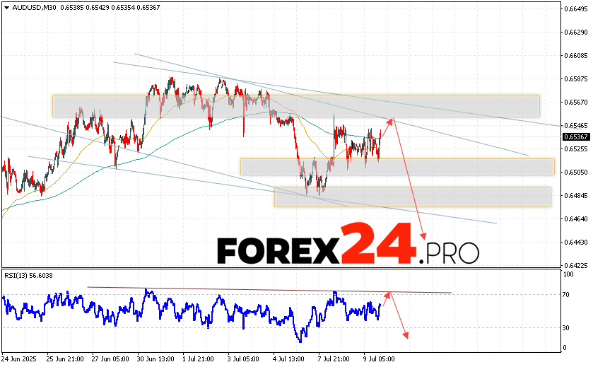 Australian Dollar Forecast AUD/USD for July 10, 2025 suggests an attempt to test the resistance level near the 0.6545 area. Further, the pair will continue to fall below the 0.6445 level. An additional signal in favor of a decline in the pair will be a rebound from the trend line on the relative strength indicator. A strong rise in AUD/USD quotes and a breakout of the 0.6585 area will cancel the decline scenario. This will indicate a continuation of the rise in quotes with a potential target above the 0.6775 level.