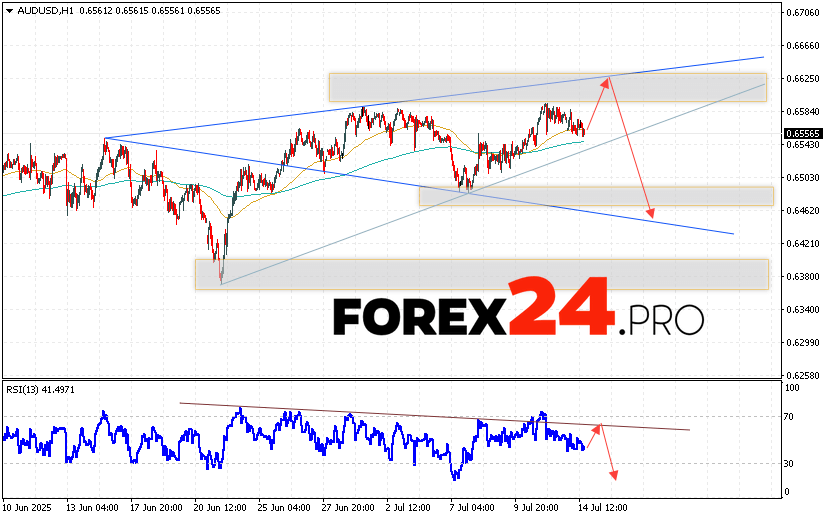 Australian Dollar Forecast AUD/USD for July 15, 2025suggests an attempt to test the resistance level near the 0.6635 area. Further, the pair will continue to fall below the 0.6445 level. An additional signal in favor of a decline in the pair will be a rebound from the trend line on the relative strength indicator. A strong rise in AUD/USD quotes and a breakout of the 0.6675 area will cancel the decline scenario. This will indicate a continuation of the rise in quotes with a potential target above the 0.6825 level.