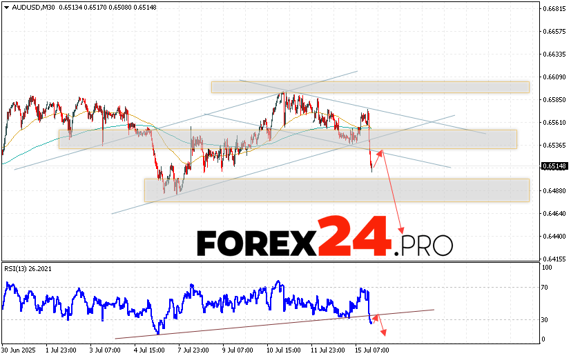 Australian Dollar Forecast AUD/USD for July 16, 2025suggests an attempt to test the resistance level near the 0.6535 area. Further, the pair will continue to fall below the 0.6445 level. An additional signal in favor of a decline in the pair will be a rebound from the trend line on the relative strength indicator. A strong rise in AUD/USD quotes and a breakout of the 0.6585 area will cancel the decline scenario. This will indicate a continuation of the rise in quotes with a potential target above the 0.6725 level.