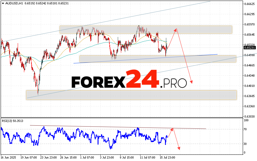 Australian Dollar Forecast AUD/USD for July 18, 2025 suggests an attempt to test the resistance level near the 0.6565 area. Further, the pair will continue to fall below the 0.6405 level. An additional signal in favor of a decline in the pair will be a rebound from the trend line on the relative strength indicator. A strong rise in AUD/USD quotes and a breakout of the 0.6635 area will cancel the decline scenario. This will indicate a continuation of the rise in quotes with a potential target above the 0.6745 level.