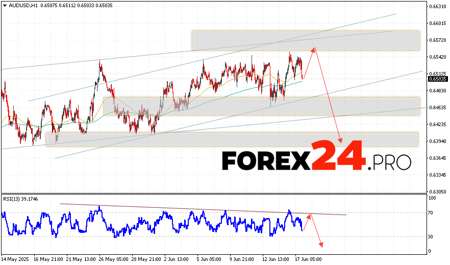 Australian Dollar Forecast AUD/USD for June 18, 2025 suggests an attempt to test the resistance level near the 0.6465 area. Further, the pair will continue to fall below the 0.6585 level. An additional signal in favor of a decline in the pair will be a rebound from the trend line on the relative strength indicator. A strong rise in AUD/USD quotes and a breakout of the 0.6635 area will cancel the decline scenario. This will indicate a continuation of the growth in quotes with a potential target above the 0.6845 level.