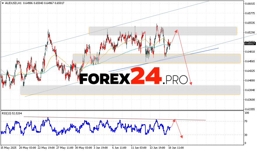 Australian Dollar Forecast AUD/USD for June 19, 2025, suggests an attempt to test the resistance level near the 0.6525 area. Further, the pair will continue to fall below the 0.6385 level. An additional signal in favor of a decline in the pair will be a rebound from the trend line on the relative strength indicator. A strong rise in AUD/USD quotes and a breakout of the 0.6595 area will cancel the decline scenario. This will indicate a continuation of the growth in quotes with a potential target above the 0.6705 level.