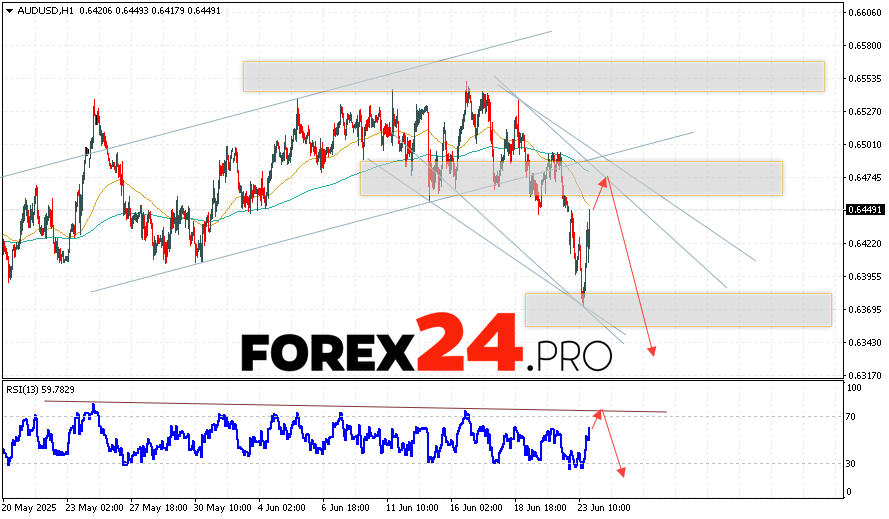 Australian Dollar Forecast AUD/USD for June 24, 2025 suggests an attempt to test the resistance level near the 0.6475 area. Further, the pair will continue to fall below the 0.6315 level. An additional signal in favor of a decline in the pair will be a rebound from the trend line on the relative strength indicator. A strong rise in AUD/USD quotes and a breakout of the 0.6515 area will cancel the decline scenario. This will indicate a continuation of the growth in quotes with a potential target above the 0.6875 level.