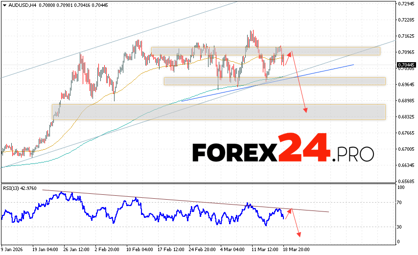 Australian Dollar Forecast AUD/USD for March 19, 2026 suggests an attempt to test the resistance level near 0.7075. Subsequently, a continued decline in the pair below 0.6845. An additional signal in favor of the pair’s decline would be a rebound from the trend line on the relative strength indicator. A strong rise in AUD/USD quotes and a breakout of the 0.7205 level would cancel out the bearish scenario. This would indicate a continued rally with a potential target above 0.7435.