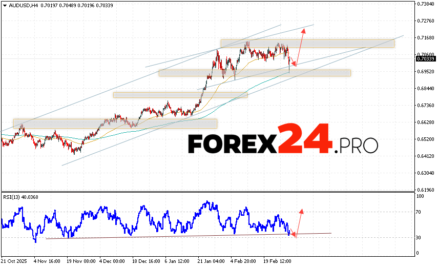 Australian Dollar Forecast AUD/USD for March 4, 2026 suggests an attempt to test the support level near 0.7015. Subsequently, continued growth above 0.7265. An additional signal in favor of the pair’s upside would be a rebound from the trend line on the relative strength indicator. The upside scenario would be cancelled if AUD/USD quotes fall and break below 0.6915. This would indicate continued declines with a potential target below 0.6685.