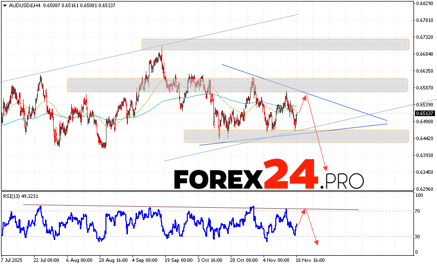 Australian Dollar Forecast AUDUSD for November 20, 2025 suggests an attempt to test the resistance level near 0.6545. Subsequently, the pair’s decline should continue above 0.6345. An additional signal supporting the pair’s decline will be a rebound from the trend line on the relative strength indicator. A strong rise in AUD/USD quotes and a breakout of the 0.6645 area will cancel the downside scenario. This will indicate continued price growth with a potential target above 0.6875.
