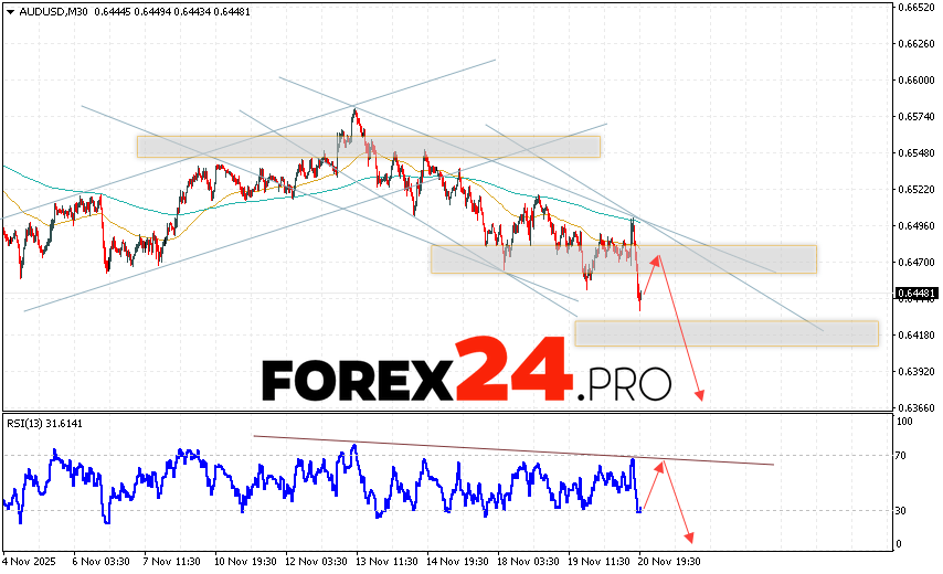 Australian Dollar Forecast AUD/USD for November 21, 2025 suggests an attempt to test the resistance level near 0.6475. Subsequently, a continued decline in the pair would be expected above 0.6385. An additional signal in favor of a decline would be a rebound from the trend line on the relative strength indicator. The downside scenario would be cancelled by a strong rise in AUD/USD quotes and a breakout of the 0.6515 area. This would indicate continued price growth with a potential target above 0.6745.
