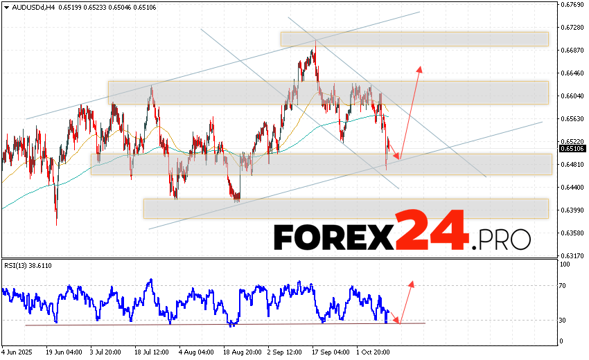 Australian Dollar Forecast AUD/USD for October 14, 2025 suggests an attempt to test the support level near 0.6485. Subsequently, continued growth above 0.6655. An additional signal in favor of the pair’s growth would be a rebound from the trend line on the relative strength indicator. The upside scenario would be cancelled if AUD/USD quotes fall and break below 0.6435. This would indicate a continued decline with a potential target below 0.6225.
