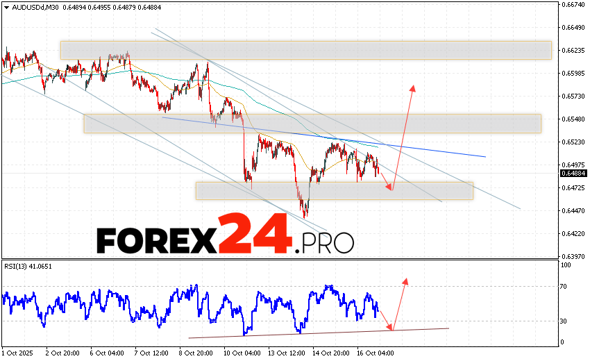 Australian Dollar Forecast AUD/USD for October 17, 2025 suggests an attempt to test the support level near 0.6465. Subsequently, the pair’s decline should be confirmed by a breakout of the support area and a close below 0.6535. An additional signal in favor of the pair’s rise will be a rebound from the trend line on the relative strength indicator. A decline in AUD/USD quotes and a breakout of the 0.6425 area will cancel the upward scenario. This will indicate a continued decline in quotes with a potential target below 0.6265.