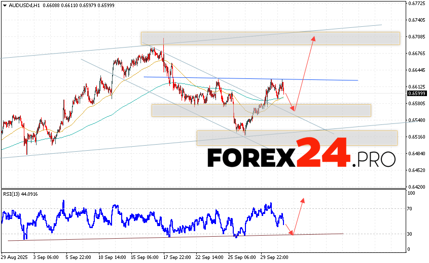 Australian Dollar Forecast AUDUSD for October 2, 2025 suggests an attempt to test the support level near 0.6565. Subsequently, continued growth above 0.6695. An additional signal in favor of the pair’s upside would be a rebound from the trend line on the relative strength indicator. The upside scenario would be cancelled if AUD/USD quotes fall and break the 0.6505 level. This would indicate a continued decline with a potential target below 0.6345.