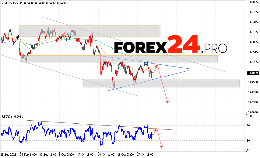Australian Dollar Forecast AUD/USD for October 22, 2025 suggests an attempt to test the resistance level near 0.6505. Subsequently, the pair’s decline should continue below 0.6395. An additional signal supporting a decline in the pair will be a rebound from the trend line on the relative strength indicator. A strong rise in AUD/USD quotes and a breakout of the 0.6535 area would cancel the downside scenario. This would indicate a continued rally with a potential target above 0.6705.