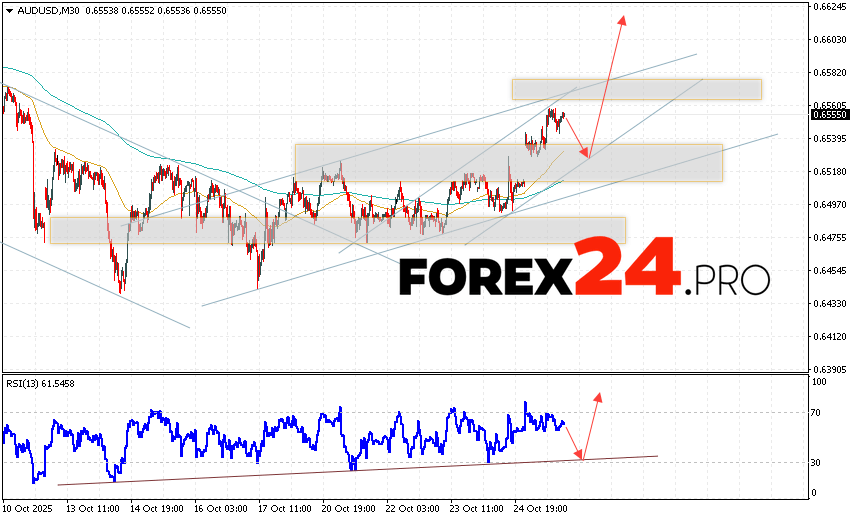 Australian Dollar Forecast AUD/USD for October 28, 2025 suggests an attempt to test the support level near 0.6525. Subsequently, continued growth above 0.6645. An additional signal in favor of the pair’s upside would be a rebound from the trend line on the relative strength indicator. The upside scenario would be cancelled if AUD/USD quotes fall and break out of the 0.6445 area. This would indicate continued declines with a potential target below 0.6325.
