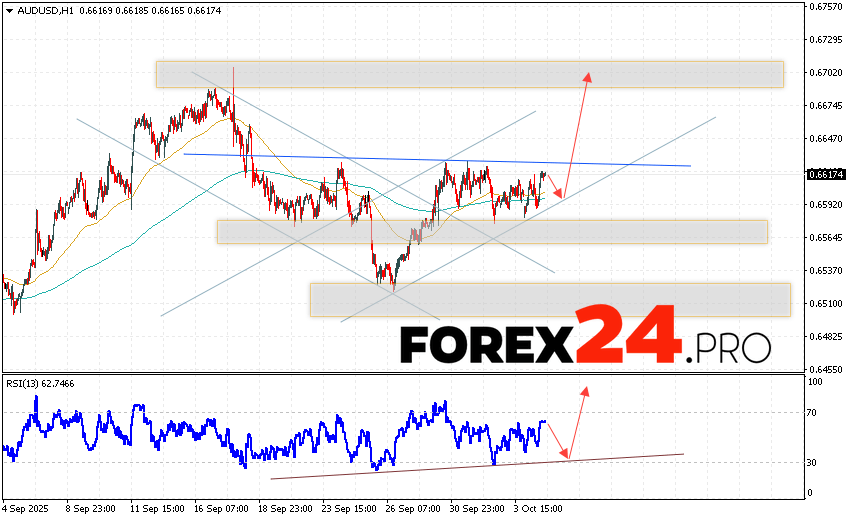 Australian Dollar Forecast AUD/USD for October 7, 2025 suggests an attempt to test the support level near 0.6575. Subsequently, the pair’s growth should continue above 0.6695. An additional signal in favor of the pair’s rise will be a rebound from the trend line on the relative strength indicator. A decline in AUD/USD quotes and a breakout of the 0.6535 area will cancel out the upward scenario. This will indicate a continued decline with a potential target below 0.6365.