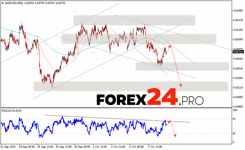 Australian Dollar Forecast AUD/USD for October 9, 2025 suggests an attempt to test the resistance level near 0.6605. Subsequently, a continued decline in the pair below 0.6525. An additional signal in favor of the pair’s decline would be a rebound from the trend line on the relative strength indicator. A strong rise in AUD/USD quotes and a breakout of the 0.6605 area would cancel the downside scenario. This would indicate continued price growth with a potential target above 0.6785.