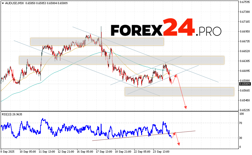 Australian Dollar Forecast AUD/USD for September 25, 2025 suggests an attempt to test the resistance level near 0.6605. Subsequently, a continued decline in the pair below 0.6535. An additional signal in favor of the pair’s decline would be a rebound from the trend line on the relative strength indicator. The downside scenario would be cancelled if AUD/USD quotes rise sharply and break above 0.6665. This would indicate a continued rally with a potential target above 0.6845.