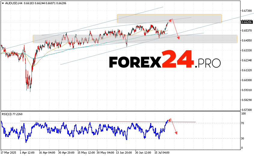 Australian Dollar Forecast AUDUSD for July 25, 2025 suggests an attempt to test the resistance level near the 0.6620 area. Further, the pair will continue to fall below the 0.6305 level. An additional signal in favor of a decline in the pair will be a rebound from the trend line on the relative strength indicator. A strong rise in AUD/USD quotes and a breakout of the 0.6655 area will cancel the decline scenario. This will indicate a continuation of the rise in quotes with a potential target above the 0.6835 level.