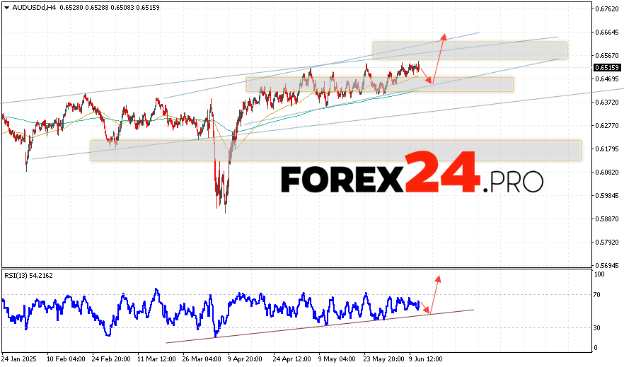 Australian Dollar Forecast AUD/USD for June 12, 2025 suggests an attempt to test the support level near the 0.6455 area. Further, the pair will continue to rise above the 0.6625 level. An additional signal in favor of the pair’s rise will be a rebound from the trend line on the relative strength indicator. A fall in AUD/USD quotes and a breakout of the 0.6425 area will cancel the growth scenario. This will indicate a continuation of the decline in quotes with a potential target below the 0.6235 level.