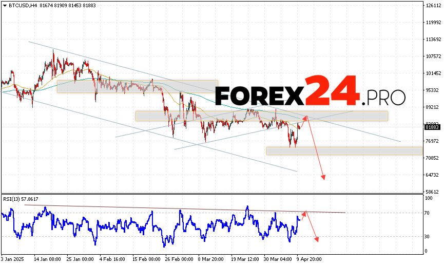 Bitcoin Forecast and Analysis for April 11, 2025 suggests an attempt to test the resistance level near the 82865 area. And then, the continuation of the fall of the cryptocurrency with a potential target at the level of 64865. An additional signal in favor of the decline of the Bitcoin rate will be a test of the resistance line on the relative strength indicator. The cancellation of the option of falling digital currency will be a breakout of the 90505 area. This will indicate continued growth of the coin with a potential target above the 95605 mark.