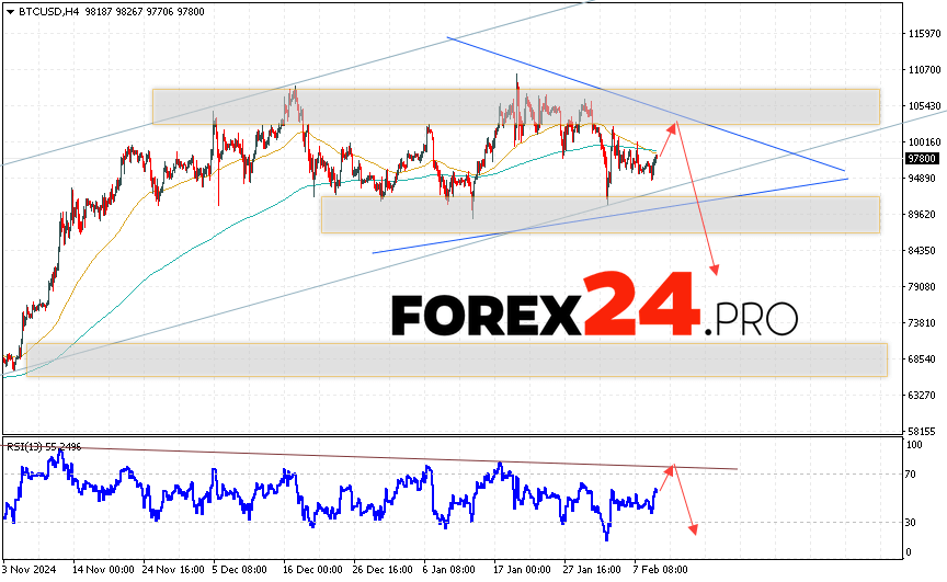 Bitcoin Forecast and Analysis for February 11, 2025 suggests an attempt to test the resistance level near the 100685 area. And then, the continuation of the fall of the cryptocurrency with a potential target at 83605. An additional signal in favor of a decrease in the Bitcoin rate will be a test of the resistance line on the relative strength indicator. The breakdown of the 110675 area will cancel the option of the digital currency falling. This will indicate continued growth of the coin with a potential target above the 116205 mark.