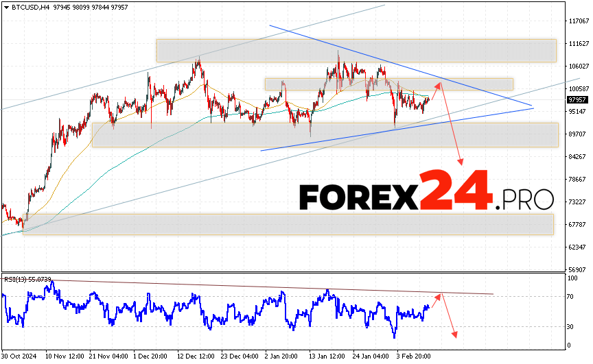 Bitcoin Forecast and Analysis for February 12, 2025 suggests an attempt to test the resistance level near the 100785 area. And then, the continuation of the fall of the cryptocurrency with a potential target at the level of 83565. An additional signal in favor of the decline in the Bitcoin rate will be a test of the resistance line on the relative strength indicator. The breakdown of the 108605 area will cancel the option of the digital currency falling. This will indicate continued growth of the coin with a potential target above the 116665 mark.