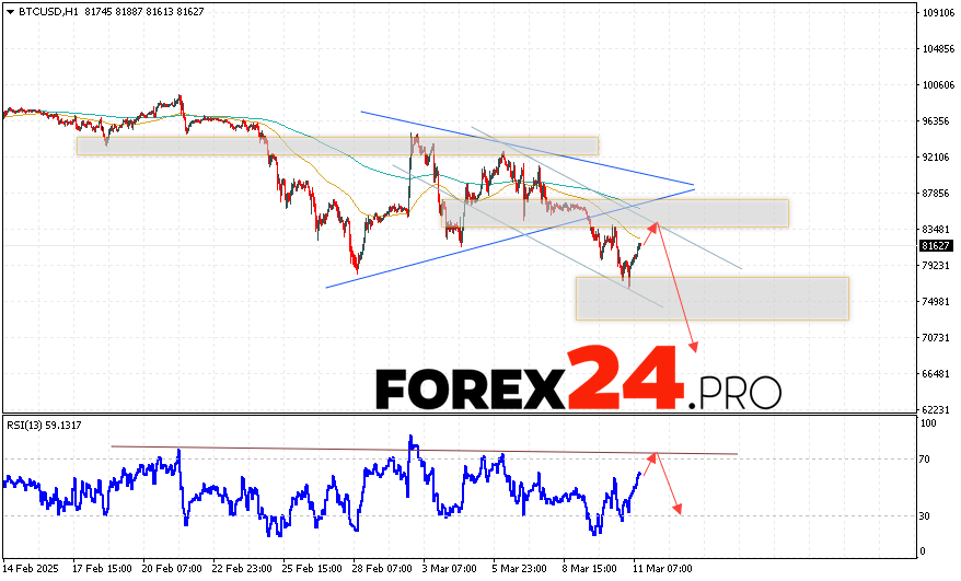 Bitcoin Forecast and Analysis for March 12, 2025 suggests an attempt to test the resistance level near the 83465 area. And then, the continuation of the fall of the cryptocurrency with a potential target at 70205. An additional signal in favor of the fall of the Bitcoin rate will be a test of the resistance line on the relative strength indicator. The cancellation of the option of falling digital currency will be a breakout of the 89865 area. This will indicate continued growth of the coin with a potential target above 95405.