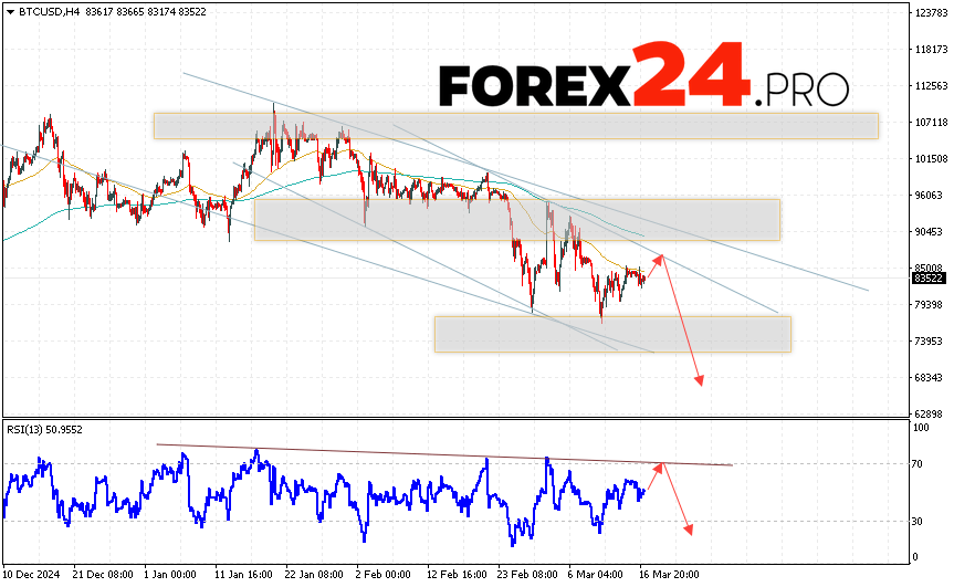 Bitcoin Forecast and Analysis for March 18, 2025 suggests an attempt to test the resistance level near the 85365 area. And then, the continuation of the fall of the cryptocurrency with a potential target at the level of 68345. An additional signal in favor of the fall of the Bitcoin rate will be a test of the resistance line on the relative strength indicator. The cancellation of the option of falling digital currency will be a breakout of the 91865 area. This will indicate continued growth of the coin with a potential target above the 95565 mark.