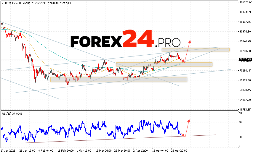 Bitcoin Forecast and BTC/USD Analysis for April 29, 2026 suggests an attempt to test the support level near 75665. Further growth would then be expected, with a potential target of 85805. An additional signal in favor of an upward trend in the Bitcoin price would be a test of the support line on the relative strength indicator. A breakout of the 75205 area would cancel out the digital currency’s upward trend. This would indicate continued decline, with a potential target below 68505.
