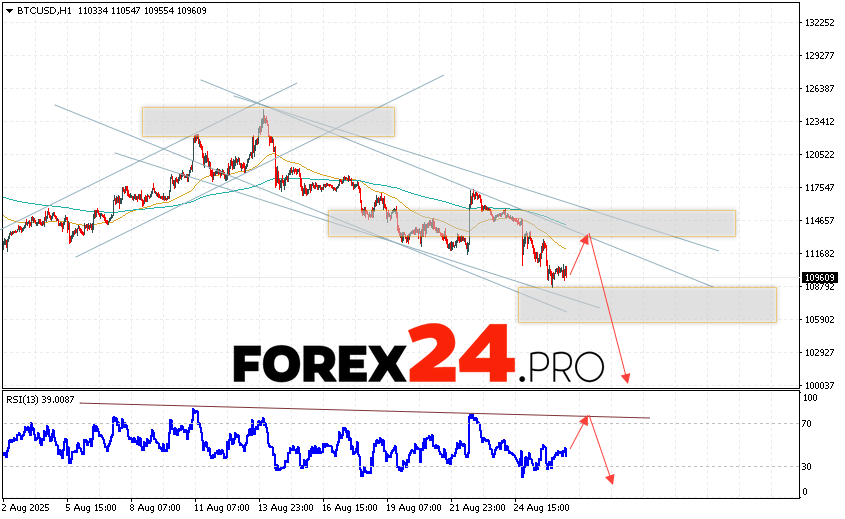 Bitcoin Forecast and BTC/USD Analysis for August 27, 2025 suggests an attempt to test the resistance level near the 112505 area. And then, the continuation of the fall of the cryptocurrency with a potential target at 100205. An additional signal in favor of a decrease in the Bitcoin rate will be a test of the resistance line on the relative strength indicator. The cancellation of the digital currency fall option will be a breakout of the 117505 area. This will indicate continued growth of the coin with a potential target above the 125675 mark.