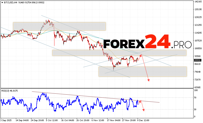 Bitcoin Forecast and BTC/USD Analysis for December 9, 2025 suggests an attempt to test the resistance level near the 93565 area. Further declines in the cryptocurrency would then be anticipated, with a potential target of 72665. A test of the resistance line on the relative strength indicator (RSI) would serve as an additional signal in favor of Bitcoin’s downward trend. A breakout of the 102505 area would cancel out the digital currency’s downward trend. This would indicate continued growth with a potential target above 110665.