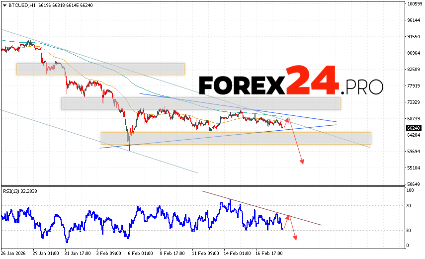 Bitcoin Forecast and BTC/USD Analysis for February 19, 2026 suggests an attempt to test the resistance level near 67895. Further declines in the cryptocurrency, with a potential target at 55205, would then be a further signal in favor of Bitcoin’s price growth. A breakout of the 73505 area would cancel out the digital currency’s downward trend. This would indicate continued upward movement with a potential target above 78575.