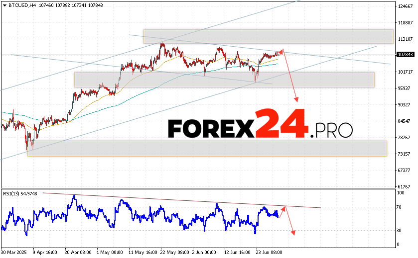Bitcoin Forecast and BTC/USD Analysis for July 1, 2025, suggests an attempt to test the resistance level near the 108365 area. Further, the cryptocurrency will continue to fall with a potential target at 90356. An additional signal in favor of a decline in the Bitcoin rate will be a test of the resistance line on the relative strength indicator. A breakout of the 113405 area will cancel the scenario of a decline in the digital currency. This will indicate a continuation of the coin’s growth with a potential target above 119505.